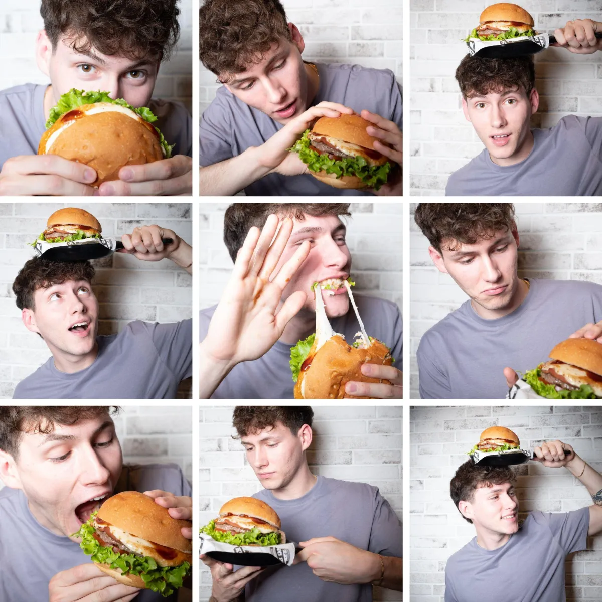 (Hamburger di manzo, insalata gentile, pomodoro ramato, cetriolo in agrodolce, edamer fuso alla piastra, cipolla caramellata, bacon di suino, salsa BBQ, salsa maionese, pane al latte artigianale)